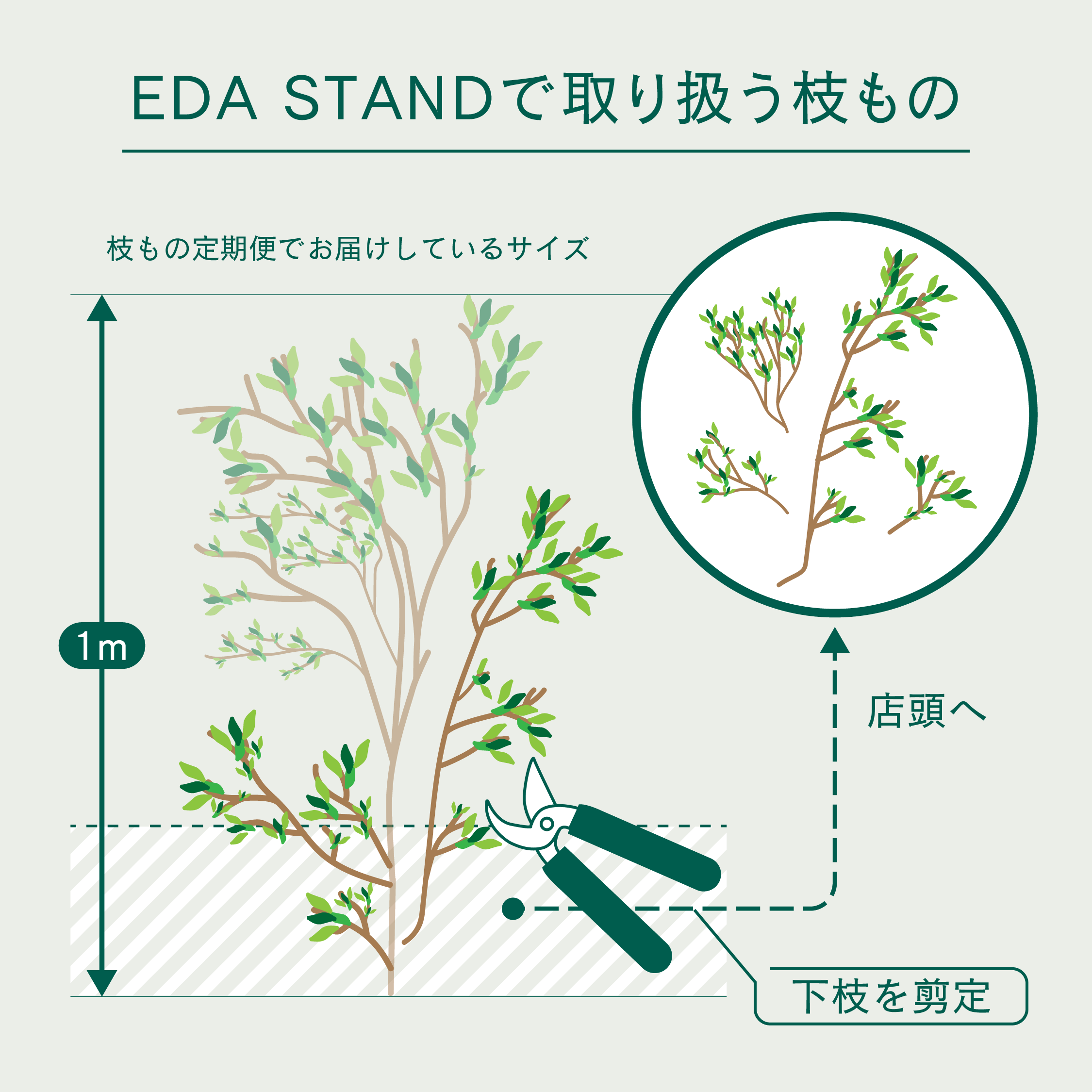 SiKiTOが運営する「枝もの定期便」では、お客様に美しく飾っていただけるよう、花瓶に浸かってしまう枝の足元部分から出る下枝をカットするなどの処理をしています。SiKiTO EDA STANDでは、この工程で発生する小さめサイズ(40~70センチ)のロス枝をリーズナブルにご提供しております。鮮度が悪いわけではありませんのでご安心ください。